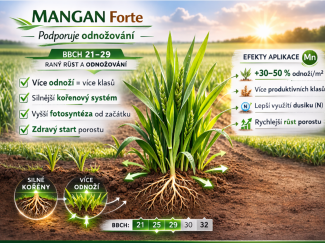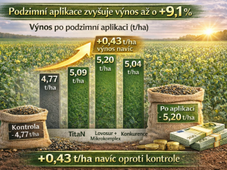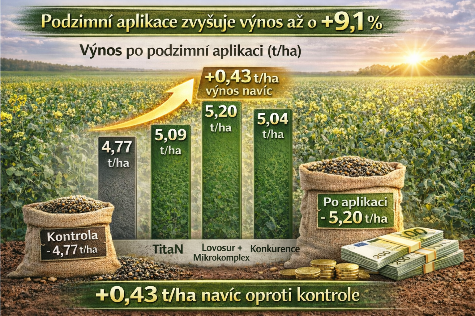 V období intenzivního růstu řepky je důležité nejen dodat dostatek hlavních živin, ale zároveň podpořit jejich efektivní využití v rostlině. V praxi se proto osvědčuje kombinace LOVOSUR (thiosíran amonný) s MIKROKOMPLEX Cu-Mn-Zn například v poměru 4 + 1 l/ha.