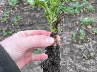 Foto 3.:  U téhle rostliny je na první pohled vidět poškození kořene verticiliem.  Kořenové svazky jsou nahnědlé. Zde je možné pomoct pouze alokací P2O3 na list.